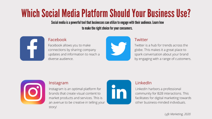 An overarching objective to keep in mind when managing your social media is that, as a small business, your message must be genuine to your company’s values while remaining connected with your audience. This oftentimes means that your promotional operations should mirror that of a customer’s social media rather than a business’s corporate updates. There are various social media platforms your business could use- Facebook, Instagram, Twitter, LinkedIn, YouTube, and Pinterest are industry giants that are fantastic for disseminating your company’s message. However, to effectively build your social media presence, you must understand which platforms work best with your business model to successfully engage consumers.