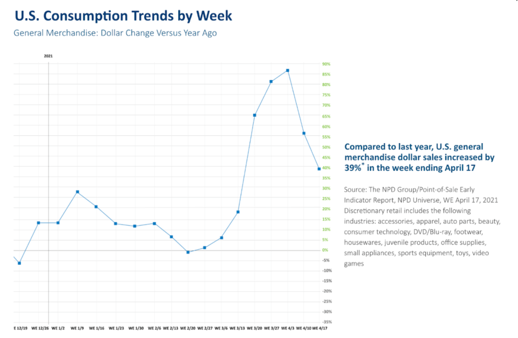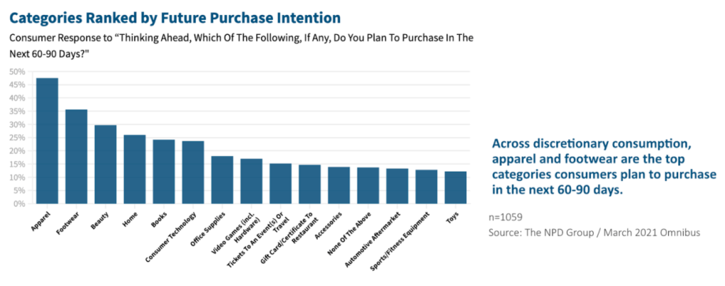 Currently, consumption trends in the United States have increased since the end of March 2021 with the first week of April showing an peaked 85% increase in general merchandise dollar sales compared to last year (NPD Group). As these numbers have tapered off, the end week of April shows an 35% increase in comparative spending when this time last year many stores were closed and parts of the country were on lockdown. The continued growth for 2021 against pre-pandemic levels is impressive. Many consumers have an increased intent to make more purchases over the next 60-90 days in 2021. Nearly 48% of consumers plan to make a purchase in the apparel industry.